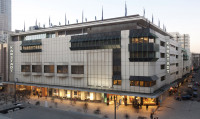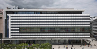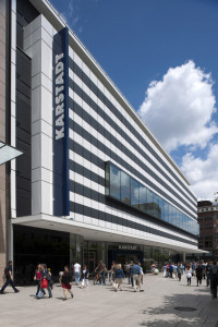 Die Fassade des Warenhauses auf der Zeil in Frankfurt stammte aus den 1980er Jahren und entsprach nicht mehr den Vorstellungen des Betreibers. Unser Projekt basiert auf der bestehenden Aluminiumpanelfassade. Die vorhandenen Bleche wurden neu lediglich beschichtet. Die zuvor bestehende unruhige Landschaft vielfältiger Erker und Vorsprünge wurde auf ein der Größe und Modernität des Hauses entsprechendes einzelnes Glasband reduziert.