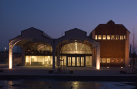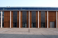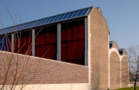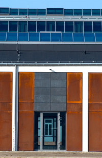 Das bestehende dreischiffige Stahlbetonskelett wurde mit einer Ausfachung aus Cortenstahl- und Bleitafeln geschlossen. Ein Teil der Konstruktion blieb unverkleidet und bindet als offene Loggia den öffentlichen Raum ein.