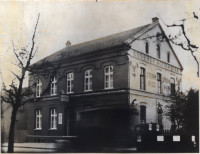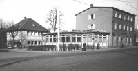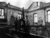 Zustand nach dem Wiederaufbau mit geänderter Dachneigung und noch sichtbarer Reparatur der Giebelwand, 1950er Jahre