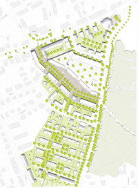 Die fingerartigen Baumreihen entlang der Wohnstraßen bringen den Stadtpark in die Stadt.