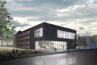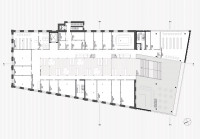 Die Eingangsfassade ist deutlich von der Straßenflucht zurückgesetzt und bildet so einen einladenden Vorplatz aus. Die Materialität des Bodenbelags dieser Platzfläche wird bis in das Foyer geführt, der öffentliche Raum läuft in das Gebäude hinein.