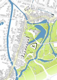 Die historische Hauptstraße der Stadt Bedburg verliert ihre Funktion als Einzelhandels und dienstleistungszentrum der Stadt an die verkehrsfgünstiger gelegenen Stadtränder. Diese Entwicklung zu stoppen war die Aufgabe des städtebaulichen Entwurfes. Unser Projekt arbeitet die Potentiale, die in der Nähe zum Wasser, den historischen Gebäuden und dem zentral gelegenen Schloßpark liegen, heraus. Zusätzliche Dynamik soll der vorgeschlagene neue Rathausstandort bringen. Die Kultivierung des historischen Stadtambientes als Versuch, den Siegeszug der Großsortimenter zu stoppen.